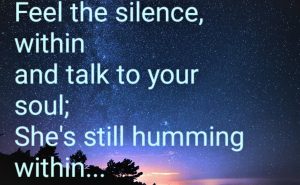 Here, being in close communion with silence doesn`t mean to detach yourself from the external hurly burly and remain the same from within. Rather, here silence means to probe more within your depth, inside your soul`s kingdom where at first you may be overwhelmed, may startle a bit, but with time get realize the true worth of detaching yourself from all those materialistic needs and noises of your surroundings and getting aligned with the deeper core of your being that never speaks anything in an audible way, but answers come, quite automatically when you yourself can feel that your entity is totally aligned to that profound silence, within. And on that very moment, once again you get introduced with the secret code of your being that`s continually beckoning you to perceive the eternal stream of life, the stream of your inner silence who only knows the truth of your existence, the truth of an eternal reality as well!