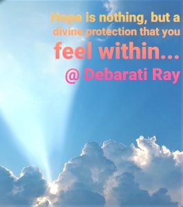 I wouldn`t describe that spark as a hope fairy with her golden wings and a magic stick in her hand, but it was something different, something hopeful that somehow I felt, was coming on its way…not only to be enthralled with its own glory but to evolve myself and to make me believe on that power of divine intelligence, surrounding us in a constructive way…and therein lies the power of hope, the power of that painful journey, I was going through that time. Days passed away, hours passed by in their habitual ways. But somehow I felt that it was not only a journey indeed but a surrender itself; surrender to that higher truth of divine intelligence. And it was only that surrender that could make me feel that I was not drowning into that huge darkness, rather evolving myself in a newer way, towards a newer path, leaving behind all the negativities and obstacles, pushing them all behind and preparing my entity to be aligned to the divine source of intelligence. I was no longer feeling forlorn or abandoned, but very much aligned to my true essence… I was not sure what next was coming towards me, but deep in my heart I had a feeling that something good is waiting for me with its cordial reception…” And the lady was not wrong with her intuition. That ray of hope not only came to her as a savior, but came as some divine power to strengthen her soul, channelizing her consciousness towards a fruitful exploration of her life. Yes! The hope itself can bring the change that your soul desires for a long time. It is nothing but the hope itself that can invoke that special power within your entity to sustain in this tough world of survival.